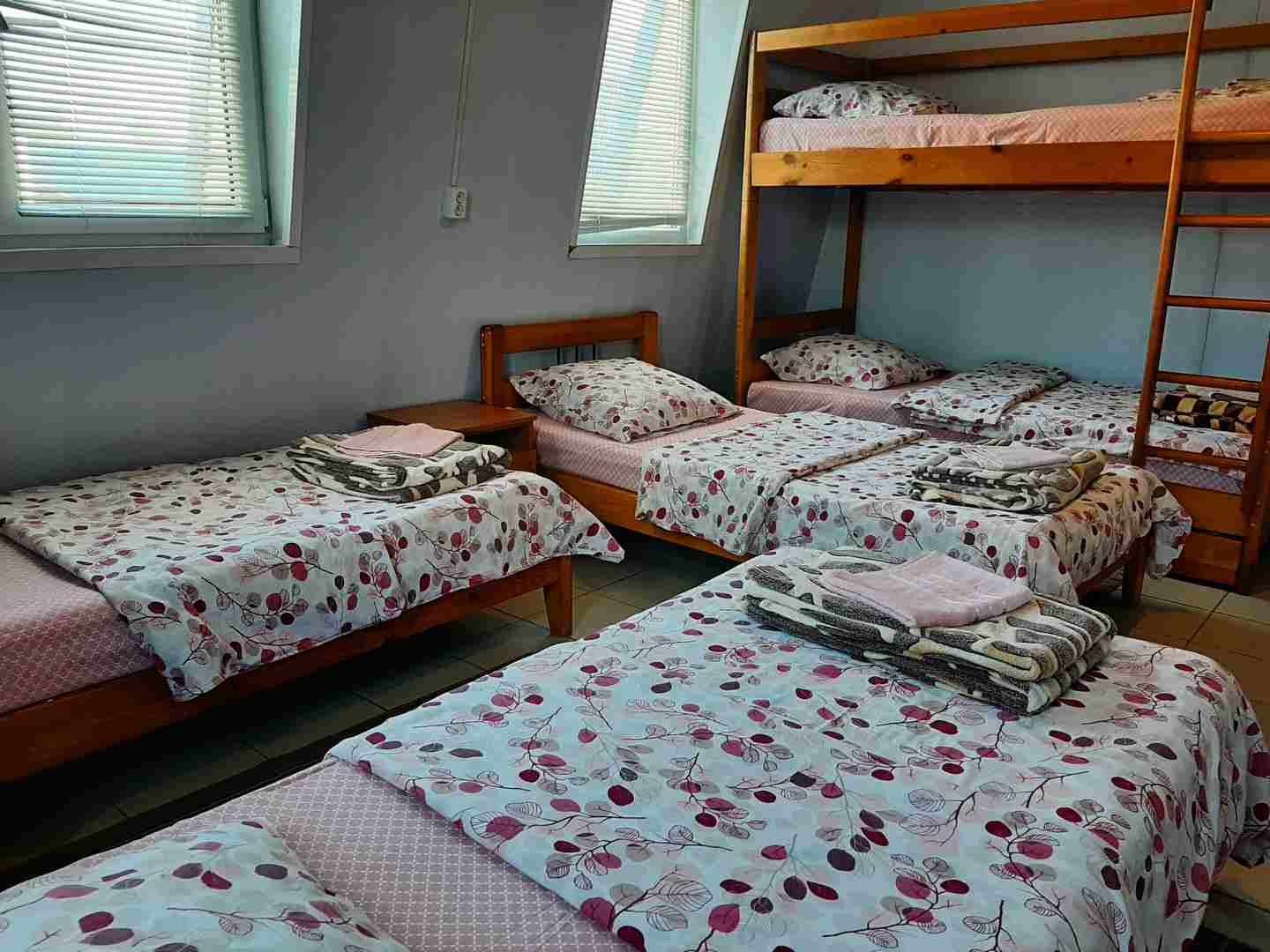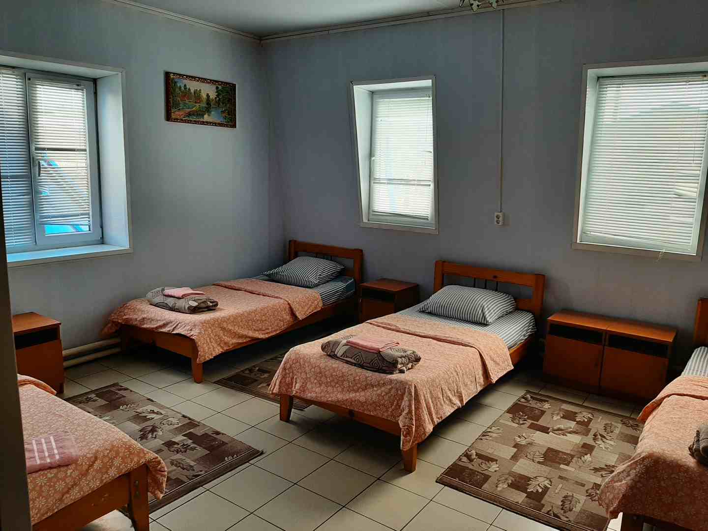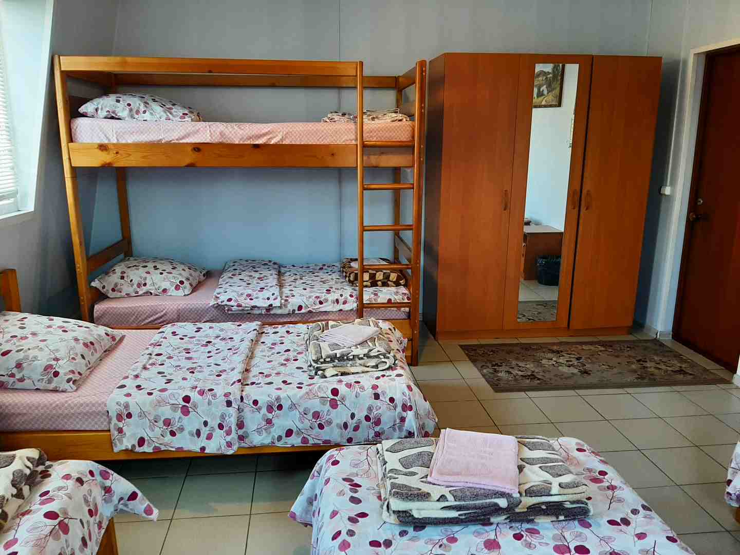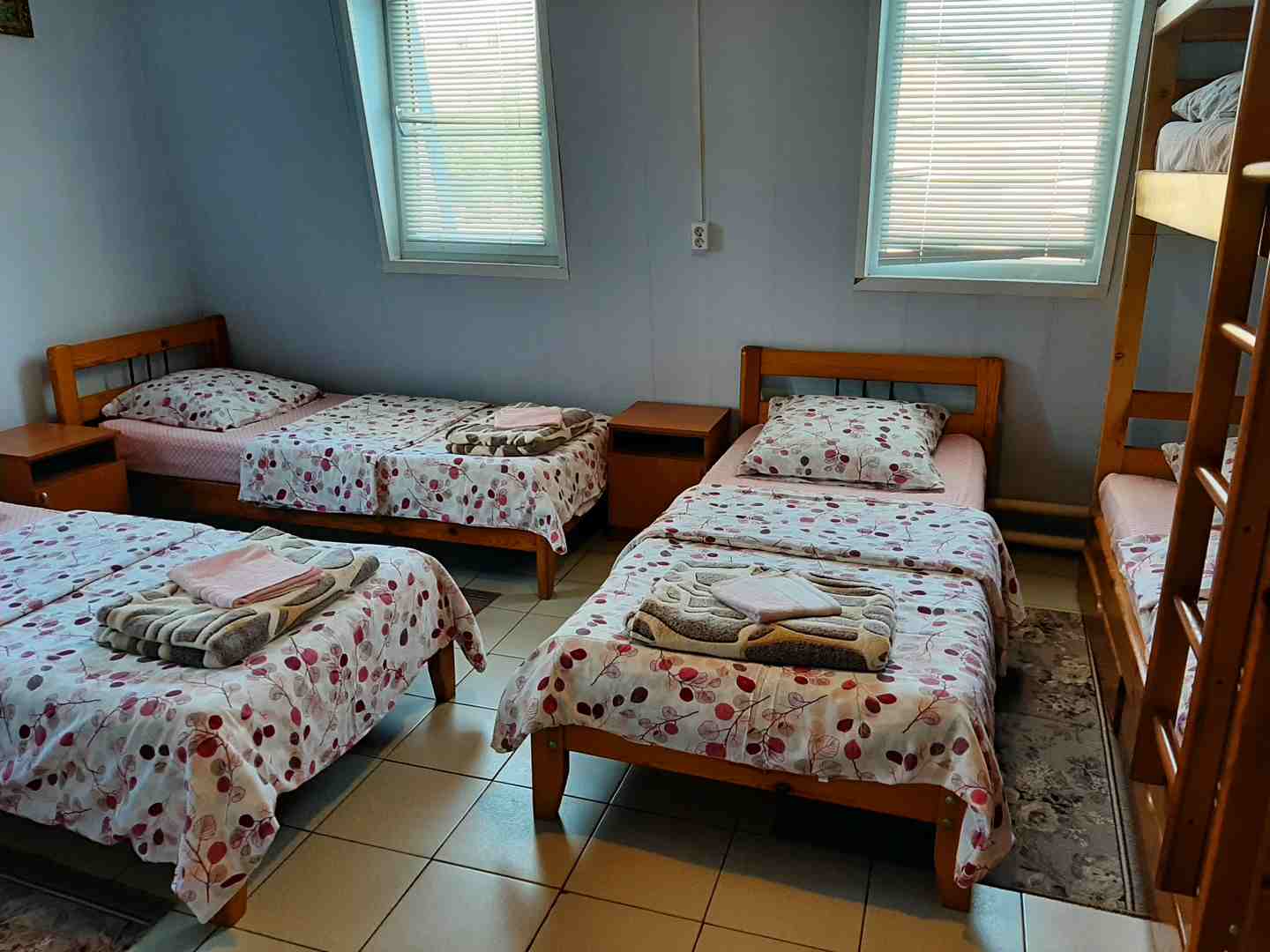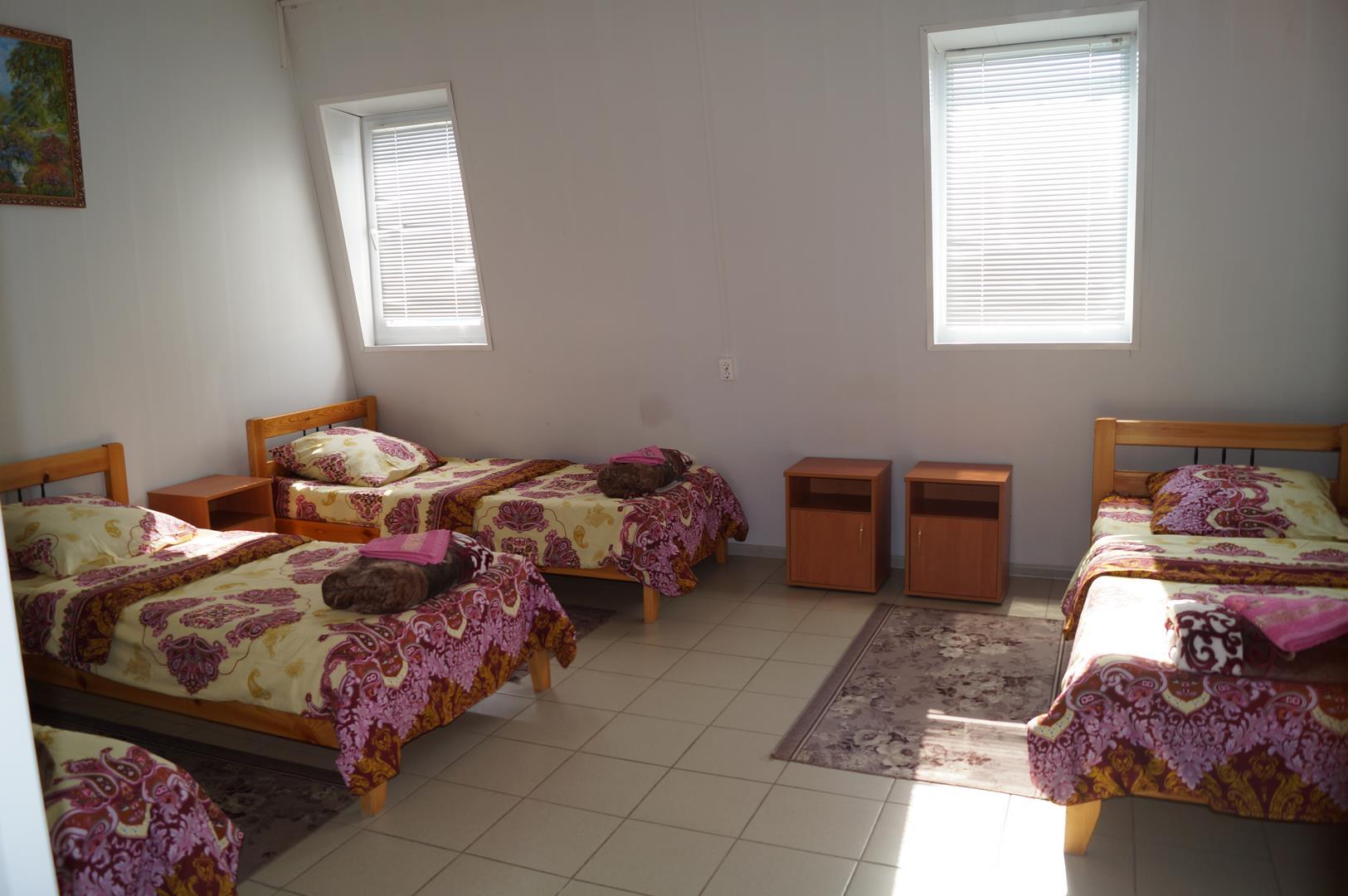 Номер рассчитан на проживание до 6 гостей. В номере 4 односпальные кровати и одна двухъярусная кровать с дополнительным спальным местом, шкаф, прикроватные тумбочки, удобства (душ, туалет) общие. Данная категория номеров отлично подойдет для большойсемьи, компании друзей, спортсменов иликомандированных сотрудников.